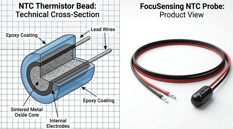 An NTC thermistor is a sintered metal-oxide resistor (manganese, nickel, etc.) whose resistance decreases exponentially with rising temperature. They dominate cost-sensitive applications like HVAC, medical devices, and EV BMS.