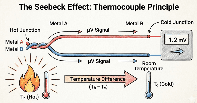 Deep Dive: Seebeck Effect Two dissimilar metals joined at a “hot junction” generate mV voltage proportional to temperature difference.