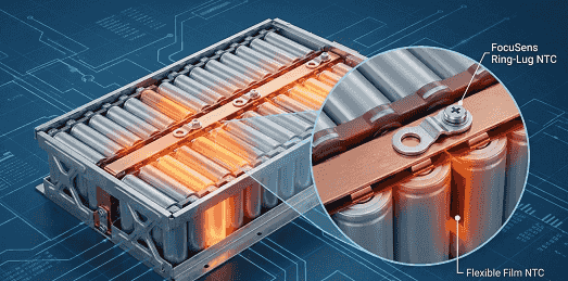 EV lithium-ion packs require 15–35°C tight control to prevent thermal runaway. NTCs dominate (cost + 100+ sensing points per pack + fast response). Flexible film or ring-lug NTCs fit between cells with 4000V insulation.